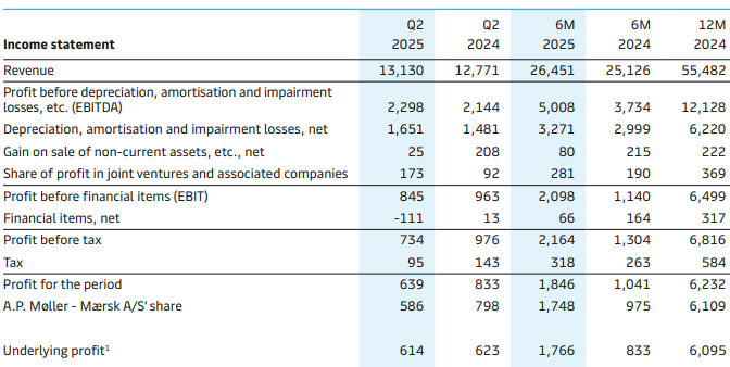 周四财报数据显示,马士基第二季度营收达131.3亿美元,超出市场预期的125.7亿美元。息税折旧摊销前利润(EBITDA)为23亿美元,同样高于市场预期的19.9亿美元。