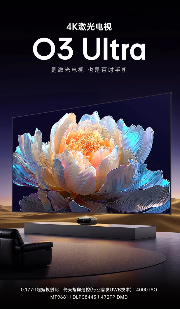 激光电视行业首家同时搭载全新旗舰 MT9681 芯片 +DLPC8445 驱动 +472TP DMD 芯片,CPU 性能较上代提升 168%,GPU 性能提升 218%,NPU 性能提升 153%,支持 VRR 可变刷新率(240Hz)、1ms 超低延迟、自动高帧率、4GB+128GB 内存。